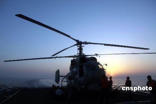 2009年4月7日,亚丁湾上,“海口”舰直升机着舰夕照 。中新社发 孙自法 摄