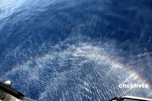 2009年4月8日,亚丁湾上,“海口”舰直升机低空悬停时,在海面激起水雾、波纹和彩虹。 中新社发 孙自法 摄