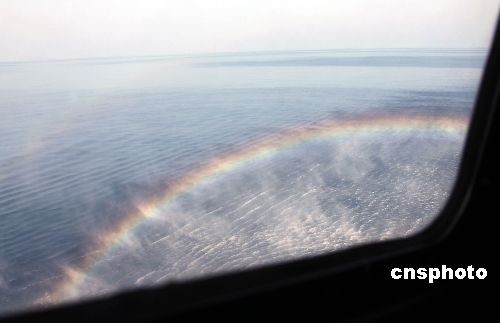 2009年4月8日,亚丁湾上,“海口”舰直升机着舰时激起的美丽彩虹。中新社发 孙自法 摄