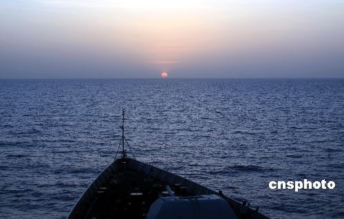 2009年4月17日,亚丁湾海上日出,一轮红日从海平面冉冉升起。 中新社发 孙自法 摄