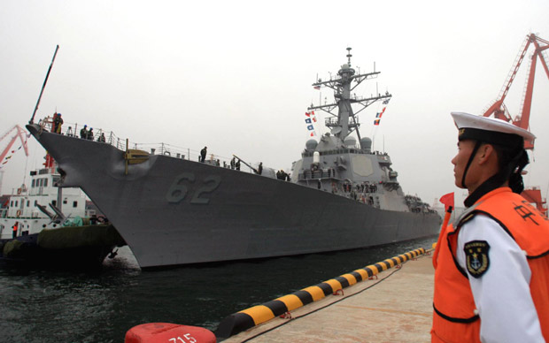 庆祝中国人民解放军海军成立六十周年多国海军活动,二十日在中国青岛拉开帷幕。14个国家共派出21艘舰艇参加此次活动。图为美国海军“菲茨杰拉德”号。张雷 摄