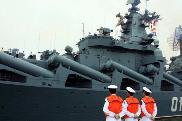 庆祝中国人民解放军海军成立六十周年多国海军活动,二十日在中国青岛拉开帷幕。14个国家共派出21艘舰艇参加此次活动。图为俄罗斯“瓦良格”号导弹巡洋舰。张雷 摄