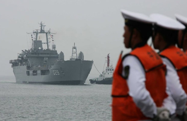 庆祝中国人民解放军海军成立六十周年多国海军活动,二十日在中国青岛拉开帷幕。14个国家共派出21艘舰艇参加此次活动。图为巴西海军“加西亚德阿维拉”号两栖登陆舰。查春明 摄