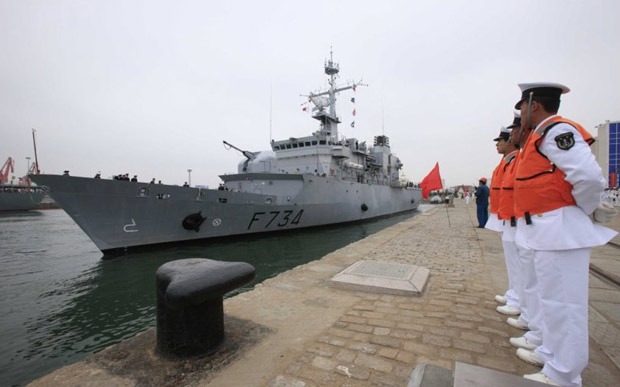 庆祝中国人民解放军海军成立六十周年多国海军活动,二十日在中国青岛拉开帷幕。14个国家共派出21艘舰艇参加此次活动。图为法国海军“葡月”号导弹护卫舰。查春明 摄