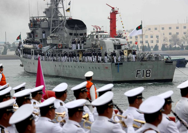 庆祝中国人民解放军海军成立六十周年多国海军活动,二十日在中国青岛拉开帷幕。14个国家共派出21艘舰艇参加此次活动。图为孟加拉国海军“奥斯曼”号导弹护卫舰。王建民 摄