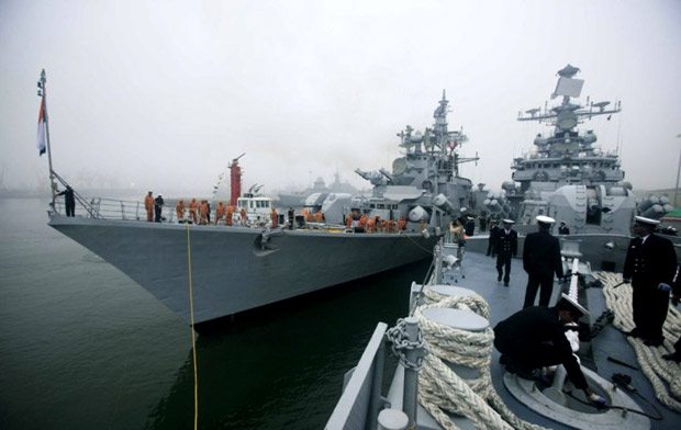 庆祝中国人民解放军海军成立六十周年多国海军活动,二十日在中国青岛拉开帷幕。14个国家共派出21艘舰艇参加此次活动。图为印度海军“孟买”号导弹驱逐舰和“兰维尔”号导弹驱逐舰。 王建民 摄