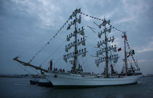 庆祝中国人民解放军海军成立六十周年多国海军活动,二十日在中国青岛拉开帷幕。14个国家共派出21艘舰艇参加此次活动。图为墨西哥海军“夸乌特莫克”号风帆训练舰。王建民 摄