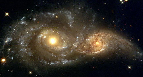 NGC 2207和IC 2163是在大犬座内的一对螺旋星系,在1835年被约翰-赫歇尔发现的。NGC 2207和IC 2163是正在碰撞和合并中的星系。大约经历10亿年的时间,它们将合并成一个椭圆星系。上图是哈勃太空望远镜于1999年11月拍摄。