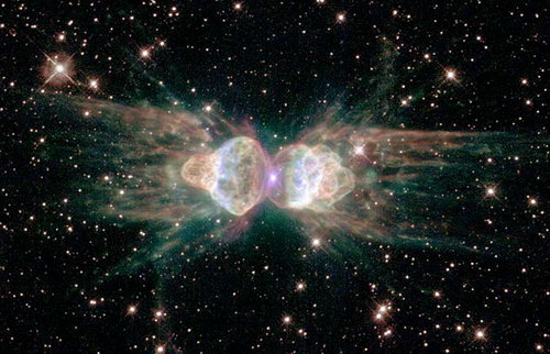 蚂蚁星云(Menzel 3,简称Mz3)是一个位于矩尺座的行星状星云,于1997年7月20日被华盛顿大学天文学家布鲁斯-贝里克和莱登大学天文学家文森特-艾克在研究哈伯太空望远镜的影像时发现的。Mz3被称为蚂蚁星云是因为它的影象好像一只普通蚂蚁的头部和胸部。 p>