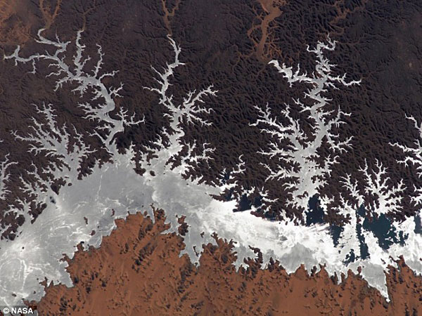 2005年,从国际空间站拍摄埃及纳塞尔湖,从图片上看,纳塞尔湖分支如同珊瑚枝