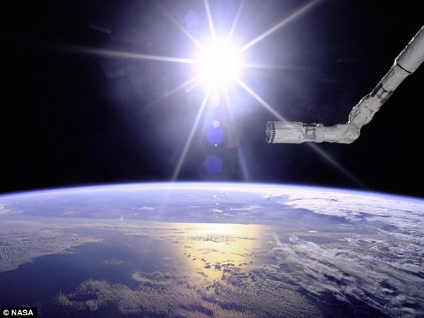 1996年,美国宇航局“奋进”号航天飞机在太阳和地球的背景下相映成辉
