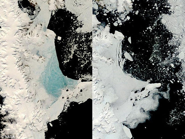 2008年12月(左图)和2009年初(右图),美国宇航局Terra人造卫星拍摄南极洲海冰形式的对比图
