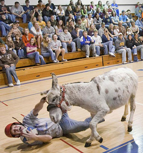近日,在美国爱荷华州举行了一场别开生面的骑驴篮球大赛,场面十分搞笑。