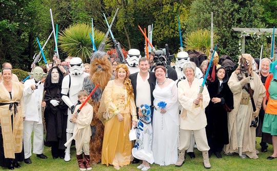 英国一对《星球大战》的影迷恋人5月4日举办了一场星战婚礼,客人被要求装扮成武士和怪兽。