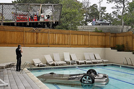 美国加利福尼亚州一女司机在停车时将车倒入一个距路面15英寸高的私家游泳池。