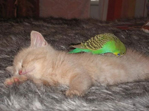 放大胆子的相思鹦鹉跳在小猫的身上。