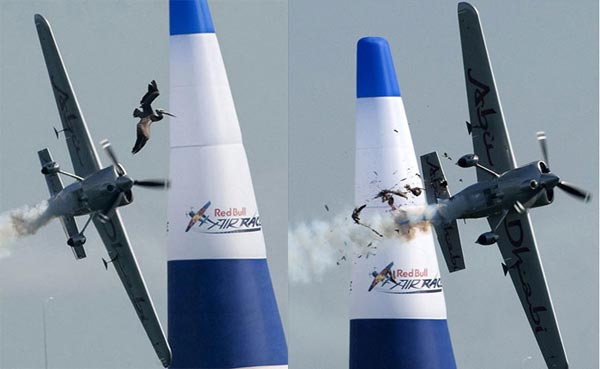 “红牛竞飞世界巡回赛” 最后一轮比赛10日在美国圣地亚哥举行,观众们在欣赏惊心动魄的特技飞行表演的同时,还意外看到了一幕“恐怖小插曲”——一只大鸟欲与高速飞行的飞机争夺“制空权”,最后被飞机的螺旋桨生生击碎!