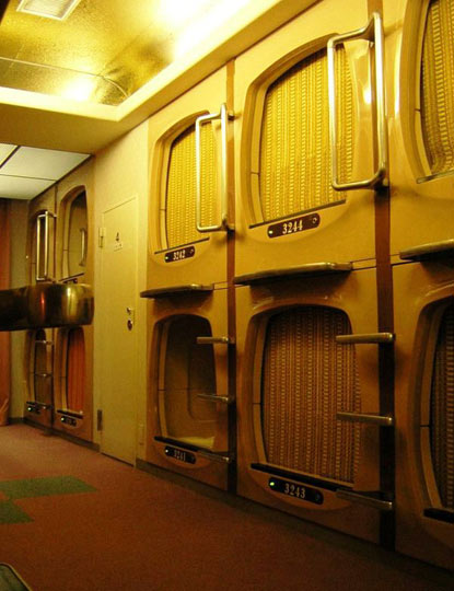 在日本,有一种非常便宜的旅馆叫胶囊旅馆。入住的客人们需将自己的行李锁在柜子里,然后通过自动售票机办理入住手续。虽然卧室很小,但里面配备了电视监控器,并有足够空间入睡。