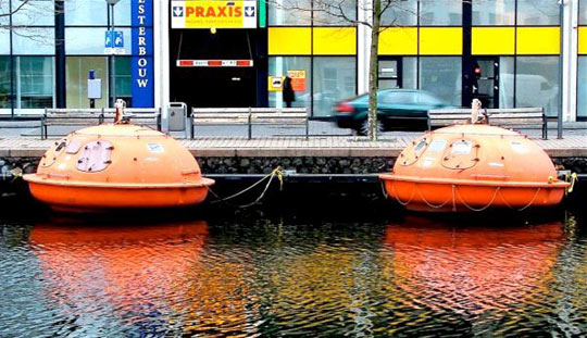 在海牙,有一种旅馆是用亮橙色的救生罐修建而成,当然旅馆要用锚固定起来。旅馆会为在这里入住的客人提供一条睡袋和类似詹姆士·邦德所吃的定量食物。