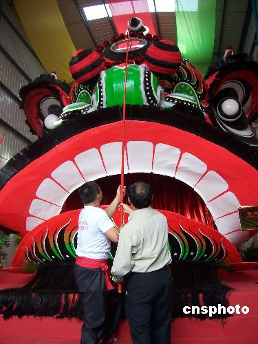 由十多名狮头制作大师耗时三个多月精心制作而成的“世界狮王”,十月三十一日在广东佛山中国龙狮运动、龙舟协会南海训练基地“点睛”面世。这只“巨无霸”高七点二八米,宽六点八九米,首尾长达三十八米,重约二吨。中新社发 孙建驹 摄