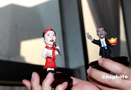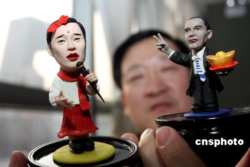 2月8日,北京朝阳区文化馆,非物质文化遗产项目传承人“面人彭”彭小平,展示他精心制作的面人新作品——小沈阳和奥巴马。当日,为迎接正月十五元宵节,朝阳区文化馆举办非物质文化遗产手工艺作品交流活动,10余位民间艺术家进行现场技艺展示。中新社发 郑雄增 摄