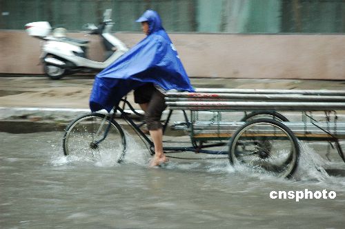 7月21日下午,一场暴雨不期而至降落在浙江台州市区。近1个小时的降雨,使市区道路多处积水,给市民出行带来不便。中新社发 (郏策) 摄