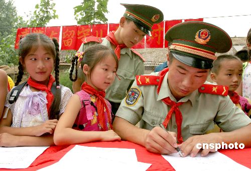 7月24日下午,淮北市烈山区宋疃镇店孜村贫困儿童刘志恒背上武警叔叔送来的新书包。当天,淮北武警战士情系贫困儿童接对仪式在烈山区宋疃镇店孜村农家小院举行,战士们带着学习用品与店孜村的10名贫困儿童接成帮扶“对子”。中新社发 李博 摄