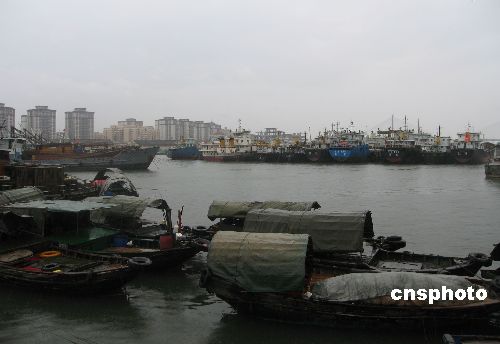 今年第六号台风“派比安”八月三日下午至四日上午将在广东台山至徐闻一带登陆。受台风影响,海南岛二万多艘渔船回港避风,九万渔民转移。图为三日上午海口渔船在新港码头避风。中新社发 尹海明 摄