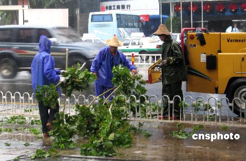 8月3日,海南海口地区出现大暴雨,海口市园林管理局正组织工人在海府路至府城路段修剪大树,以防御热带海洋风暴“派比安”形成的台风来袭。中新社发 赵曼莉 摄