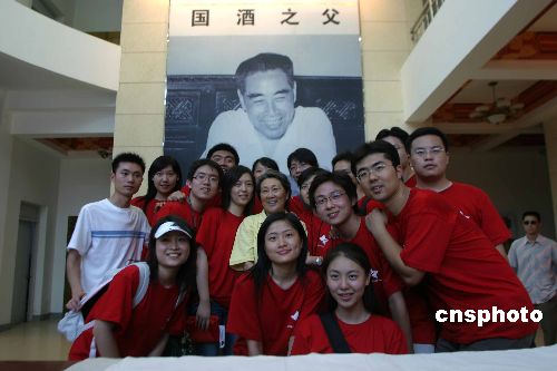 8月2日,周恩来侄女周秉德与重走长征路的北京大学生,在红军三渡赤水的遵义市仁怀县茅台镇高兴地在一起合影。当日,“情系长征路——开国元勋子女重走长征路”与“重走长征路 弘扬爱国情——首都大学生纪念长征胜利70周年主题社会实践”贵州分团在茅台镇不期而遇。中新社发 田地 摄
