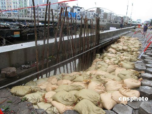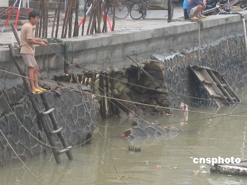 八月五日,受“派比安”环流影响,广西沿海地区普降大暴雨,最大降水量达二百五十六毫米。受强降水天气影响,广西北海市外沙渔港小段海堤坍塌。中新社发 莫秦 摄