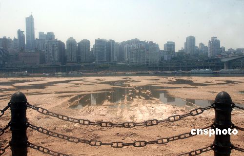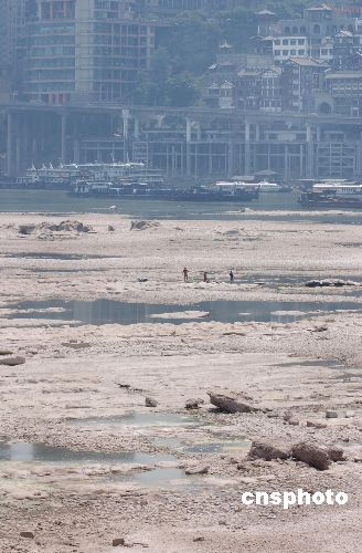八月中旬,持续一月的高温干旱使本处于汛期的嘉陵江出现枯水景象,部分河段水位线已经见底。邻近重庆北滨路的嘉陵江河段部分地势较高的河床已经裸露在阳光下。中新社发 郭晋嘉 摄