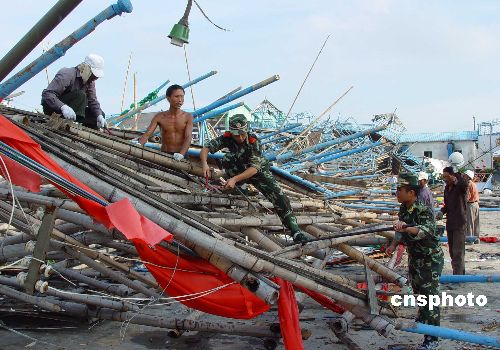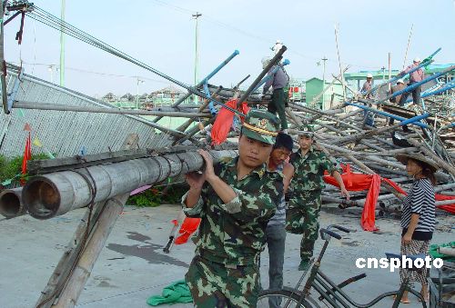 8月10日,今年第8号超强台风“桑美”在浙江温州登陆,给温州沿海人民带来了巨大的灾难。台风过境后,驻温边防部队迅速投入灾后救援工作,帮助灾民修建倒塌的房屋,在废墟中重建美好家园。中新社发 吴水斌 摄