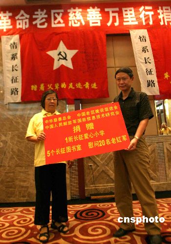 八月十五日,纪念红军长征胜利七十周年“情系长征路革命老区慈善万里行”捐赠仪式在四川省会成都举行,任弼时之女任远征代表重走长征路的开国元勋子女和中华慈善总会、中国老区建设促进会、中国人民解放军国防信息技术研究会,向四川省慈善总会捐赠一所长征爱心小学、五个长征爱心图书室,并慰问二十名老红军。中新社发 田地 摄
