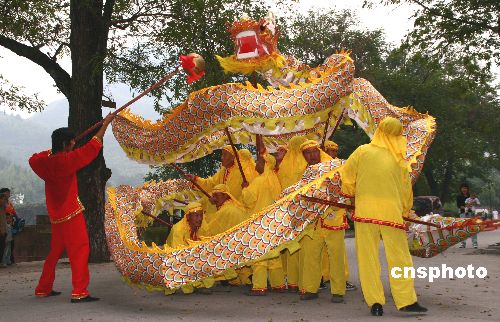 9月29日,齐云山脚下龙腾狮舞庆国庆迎中秋。当日下午,安徽休宁齐云山脚下的岩脚农民龙狮队在齐云山大道上龙腾狮舞,忽左忽右,忽高忽低,忽摇头忽摆尾,或腾空跃起,或盘旋翻滚,与全国4A级名胜风景齐云山交相辉映。中新社发 方也广德 摄