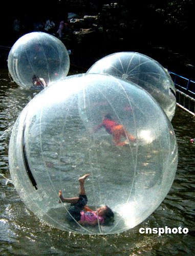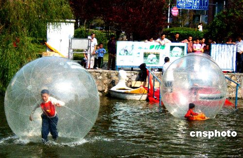 2006年10月2日,湖北宜昌小朋友在公园玩水上步行球。今年“十一”国庆期间,湖北宜昌儿童公园推出水上步行球,人在球中走,球在水上行,受到市民及儿童的喜爱。中新社发 任卫红 摄