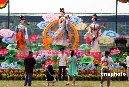 中秋将至,广东省内各旅游景点纷纷张灯结彩迎佳节。图为广东三水荷花世界门前,嫦娥奔月的彩灯吸引不少游客合影。中新社发 柯小军 摄
