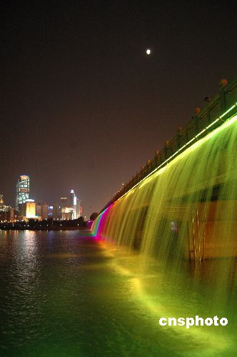 十月六日晚,广西南宁市南湖大桥大型景观瀑布银河飞泻,每侧的喷水面长二百五十米,整座桥梁上装有成千上万的七彩高强度发光灯,当景观瀑布在夜间喷水时,瀑布会呈现赤橙黄绿青蓝紫等不同颜色,与空中的圆月交相辉映,将南宁的中秋之夜打扮得如诗如画。中新社发 蒋雪林 摄