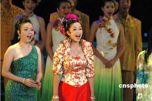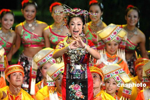 十月三十日晚,中国—东盟纪念峰会文艺晚会在南宁举行。中国国务院总理温家宝和东盟十国领导人均出席晚会。中国东盟十国艺术家同唱壮族歌曲《阿依莎娜妮亚》,“阿依莎娜妮亚”在中国的壮族言里寓意为“吉祥祝福”。中新社发 蒋雪林 摄