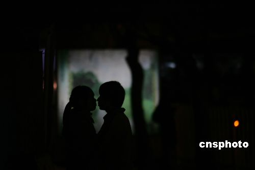 二月十四日晚,一对情人在北京街头拥吻,享受甜蜜爱情。中新社发 武仲林 摄