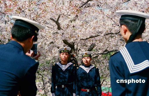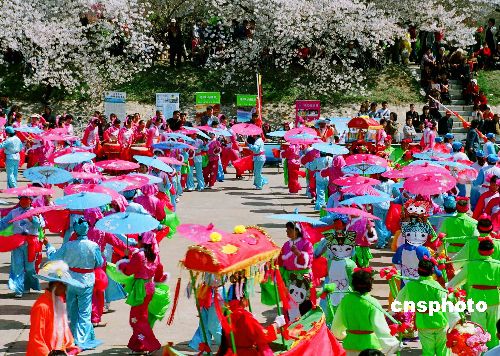 4月25日,辽宁大连旅顺龙王塘公园樱花绽放,满园飘香。当日,第三届大连旅顺樱花节开幕,开幕式上有许多民俗表演。中新社发 王锡增 摄