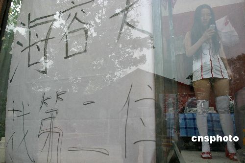 | 2007年4月30日,行为艺术家也夫和海容天天一起在橱窗内生存体验已经过去了七天,开始了新的一个周期。当日凌晨,记者收到海容天天的短信:“海容天天已经完成一个星期的轮回,并且为也夫寻找第二位橱窗妻子,直到行为结束。”在白天的采访中,记者看到海容天天的浴帘上也写有“为也夫寻找第二位橱窗妻子”的字样。在回答记者提问时,海容天天说前日晚间到了女性的生理周期,情绪很不好,所以有了这样的冲动,但在白天的感觉要好了很多,她会坚持下去。当然如果有人愿意作也夫的第二位橱窗妻子,她也会选择退出。他们的“橱窗计划”从4月22日下午开始,原定到5月22日下午结束。中新社发 鲁谷 摄