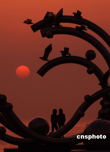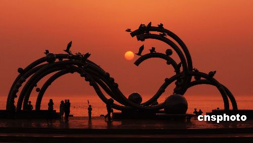 6月3日日出前,一些外地游客在导游引领下来到大连市海之韵东海公园观日出。一轮红日从东海冉冉升起,让海上观日出的游客们大饱眼福,流连忘返。 中新社发 刘德斌 摄