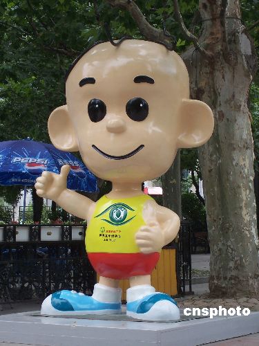 7月3日,高约3米的特奥会吉祥物“阳光三毛”雕塑亮相上海街头,成为迎接2007年中国上海世界特奥会的一道亮丽风景。中新社发 周东潮 摄