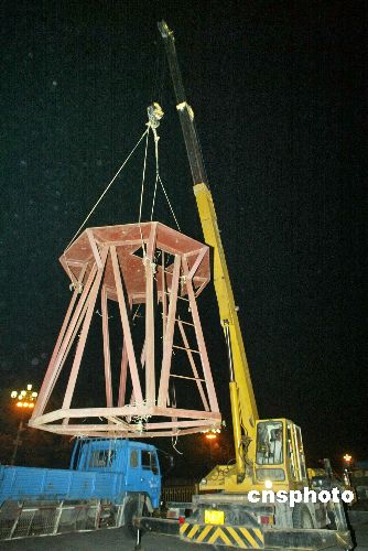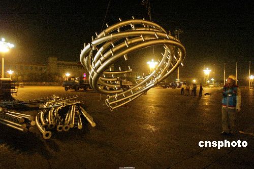 9月5日凌晨,2007年国庆节天安门广场花坛布置工程正式进场施工。30余辆轻型卡车满载着中心喷泉管路、花架、闸线、喷头、电缆等花坛基础设施驶入天安门广场,为不影响交通和天安门广场的游览秩序,所有的大型景观硬件都是先在天安门以外的地方加工好,然后在夜间运到广场组装。中新社发 李惠均 摄