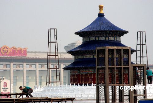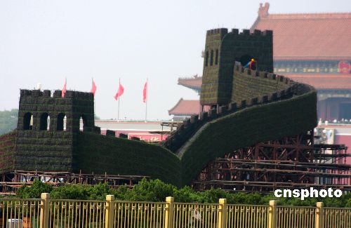 9月12日,一座蜿蜒起伏插满五色草的长城出现在天安门广场东侧。这是“从雅典到长城”国庆花坛的一部分。 同时,“祈年殿”、“奥运五环”国庆花坛也露出芳容。中新社发 吴芒子 摄