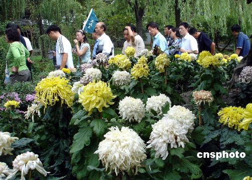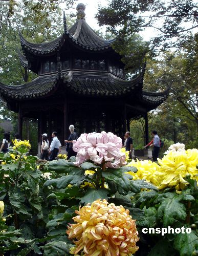 9月21日,游人在苏州拙政园观花赏景。近日,苏州古典园林拙政园内2万多盆菊花纷纷亮相,风韵各异的菊花吸引了众多游客前往观赏,更给这座古典园林增添靓丽风景。中新社发 王建康 摄