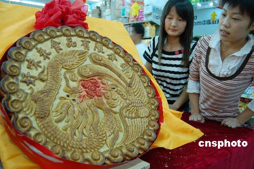 9月23日下午,安徽省界首市一女孩被当地商厦内展出的超大本土月饼所吸引。据介绍,这块月饼是目前当地制作出的最大的一块月饼,它主要以花生、桃仁、豆沙、芝麻等十多种原料为馅,寓意十全十美。月饼的主图案是传统的龙凤呈祥。商家说,这块“广告月饼”是为了促销而打造的,只展不卖。中新社发 王彪 摄