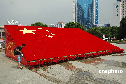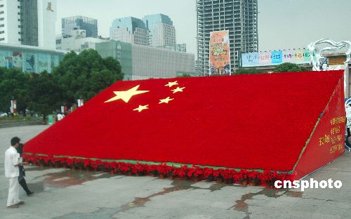 9月25日,10万朵康乃馨鲜花“绣”成的百平方米巨幅五星红旗出现在杭州武林广场,成为杭城“十一”国庆的一道独特风景。制作者以此来庆祝祖国母亲58周年生日。中新社发 引炜 摄
