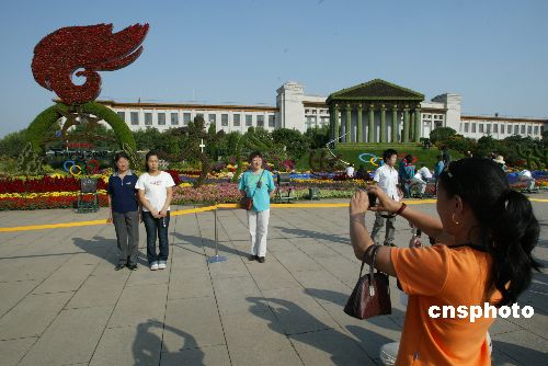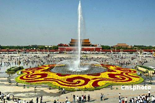 9月25日,在天安门广场拍摄的以“万众一心”为主题的中心花坛。当日,天安门广场国庆花坛布置工程全面完成,正式向社会开放。本次花坛布置共使用花卉等植物材料130多种、40万盆。其中有20多个品种是精选的奥运花卉品种。今年的花期也将较往年延长一周左右。中心花坛以“万众一心”为主题,广场东侧画卷花坛主题为“同一个世界同一个梦想喜迎奥运盛会”,以雅典卫城、长城、火炬接力标志为主景。花坛还贯穿有火炬接力的花跑道,并点缀有2008年奥运会体育图标造型,广场西侧的花坛在设计上体现了全国人民欢庆十七大胜利召开,设计主题为“同一个家园,同一个愿望,共谱和谐篇章”,整个花坛中设计了浙江嘉兴南湖游船、遵义会址、延安宝塔等景观。中新社发 李惠均 摄